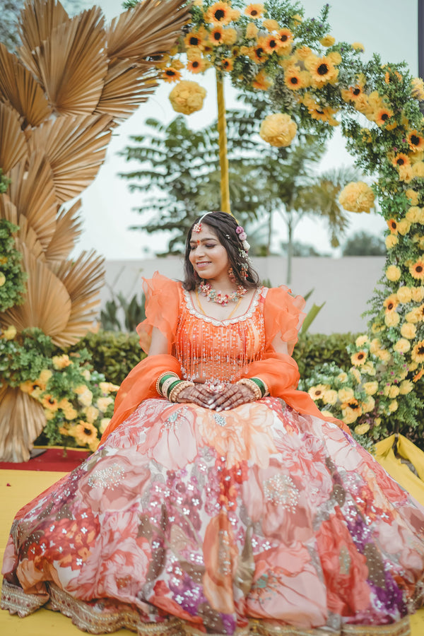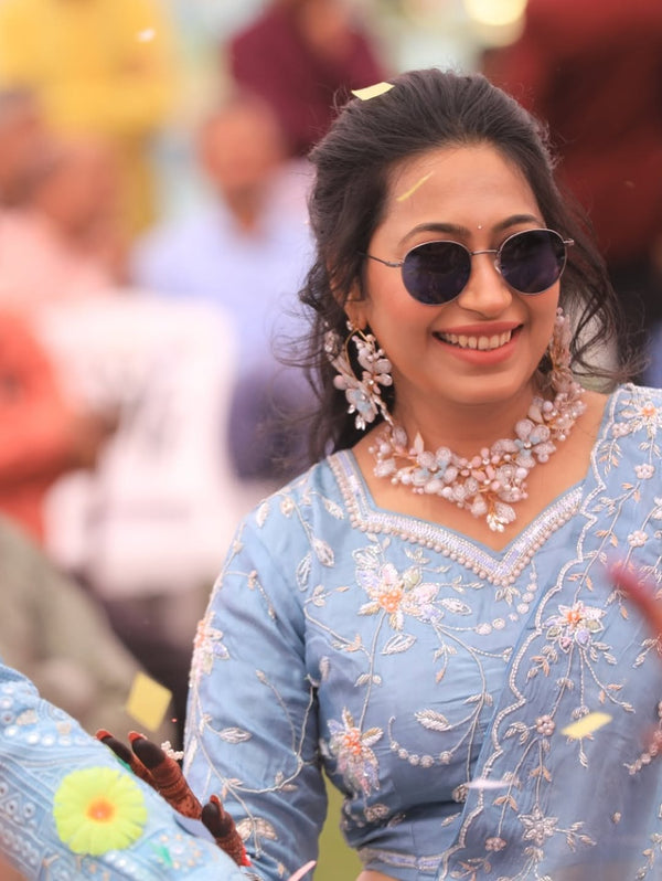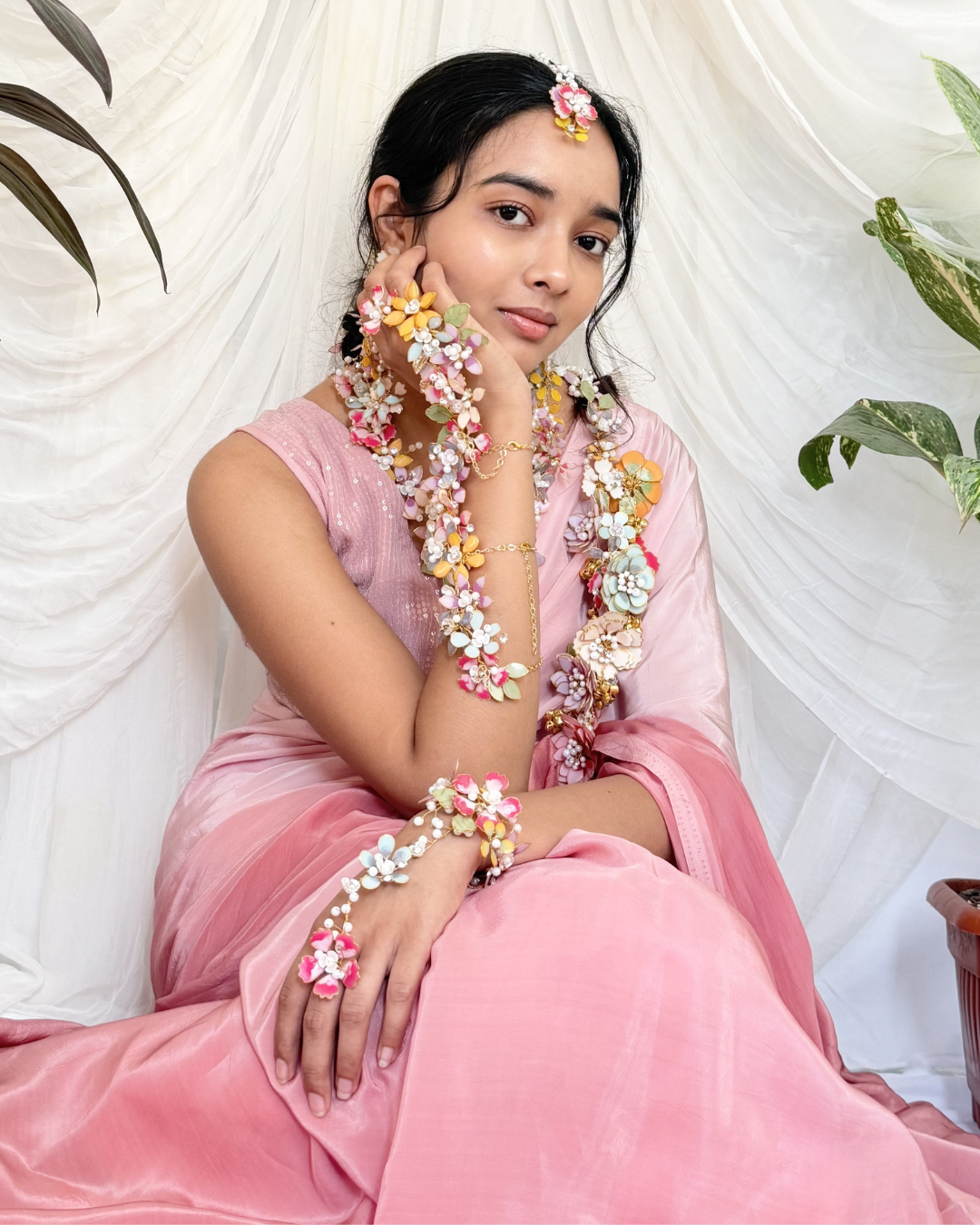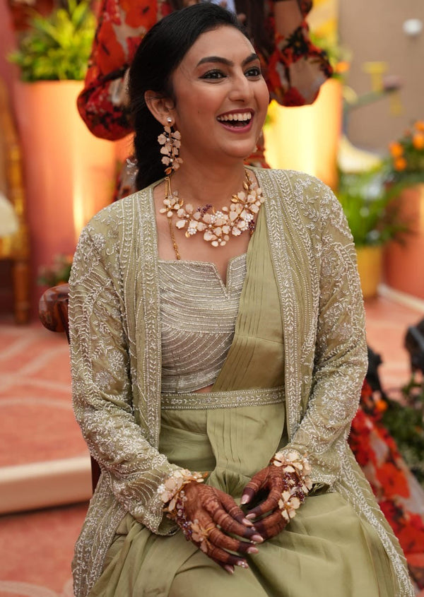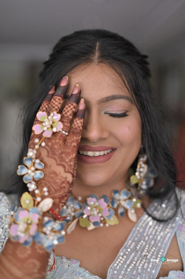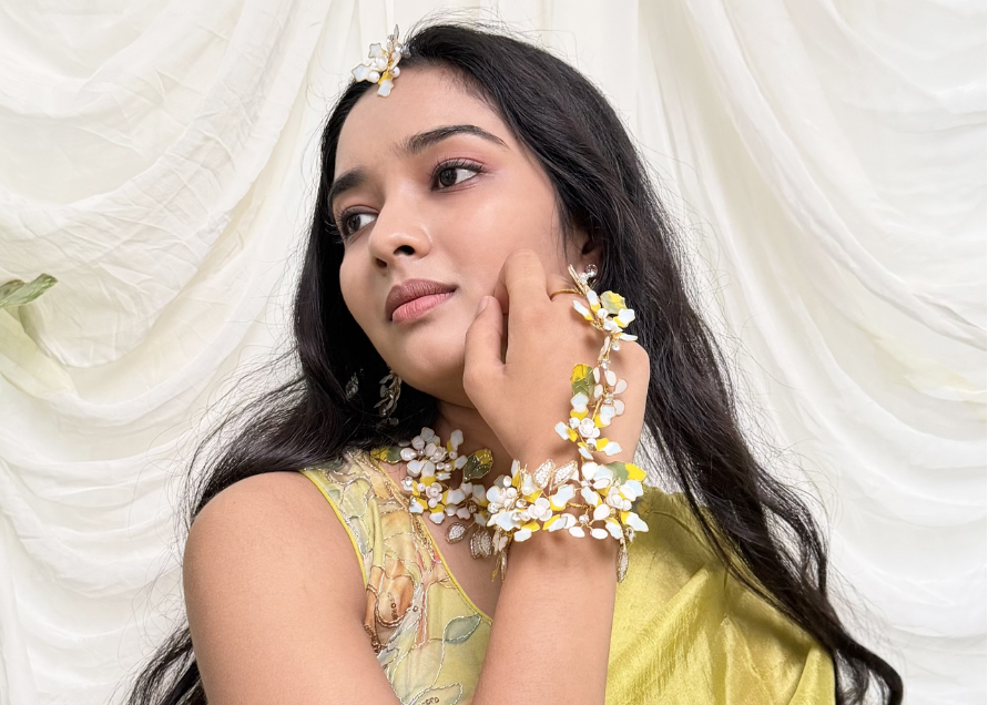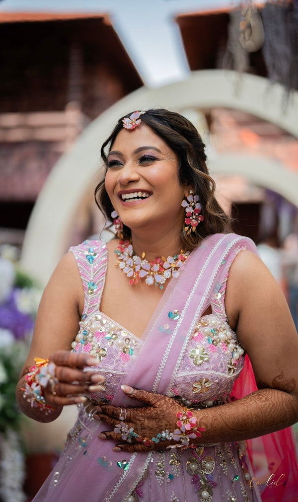 Our floral jewellery pieces styled seamlessly for a soft, romantic haldi celebration.