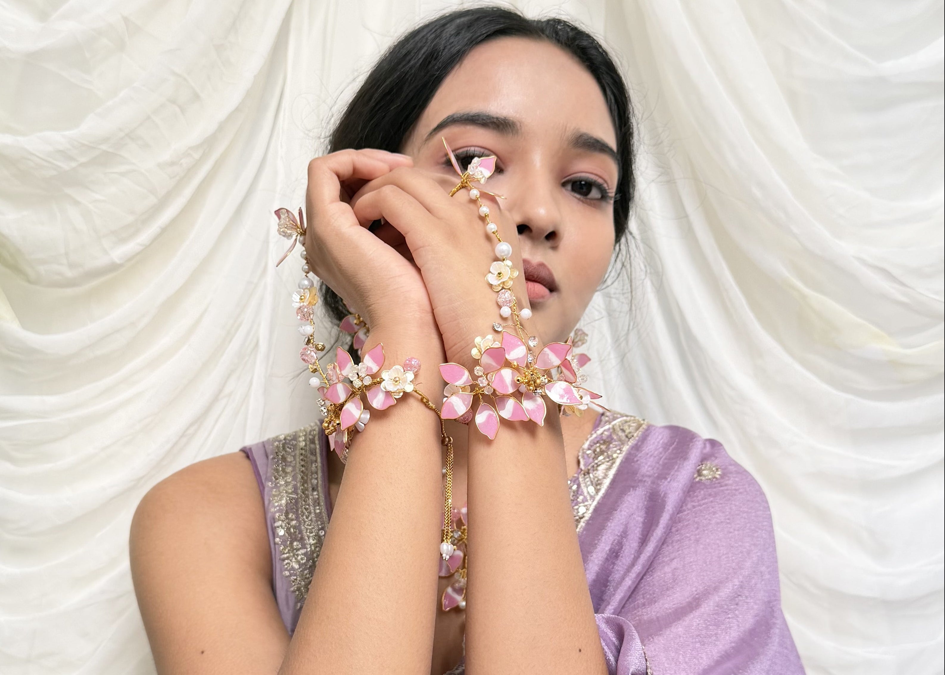 An understated yet commanding floral statement. Earrings, necklace, and hand harness finished with couture precision.