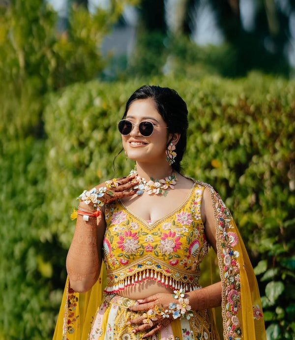 A radiant haldi look styled with delicate floral jewellery for a fresh, joyful celebration.
