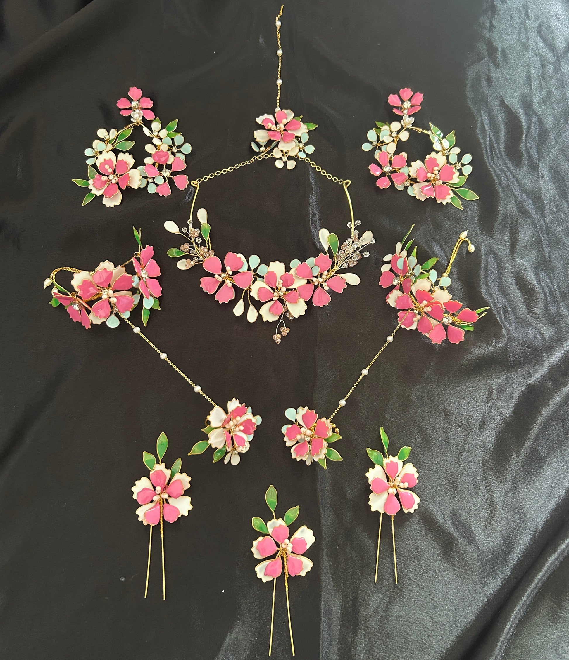 The Carolina Set is graceful, romantic, and effortlessly refined. Designed with delicate floral accents, soft pearl highlights, and warm golden tones, the necklace, earrings, hand harness, and maang tikka come together in elegant harmony. Perfect for weddings, festive rituals, or intimate celebrations—Carolina is timeless charm with a soft, radiant glow. ✨