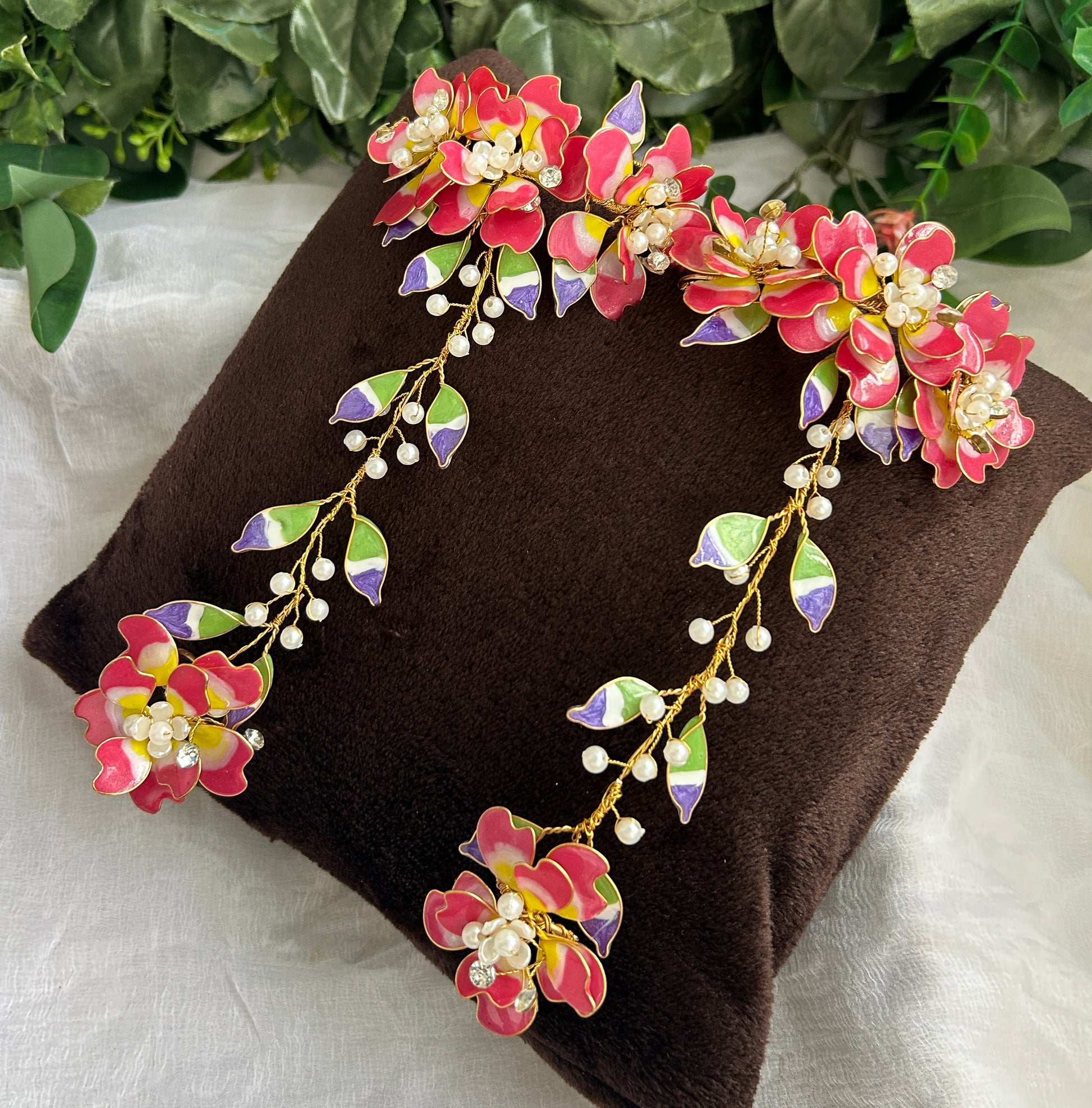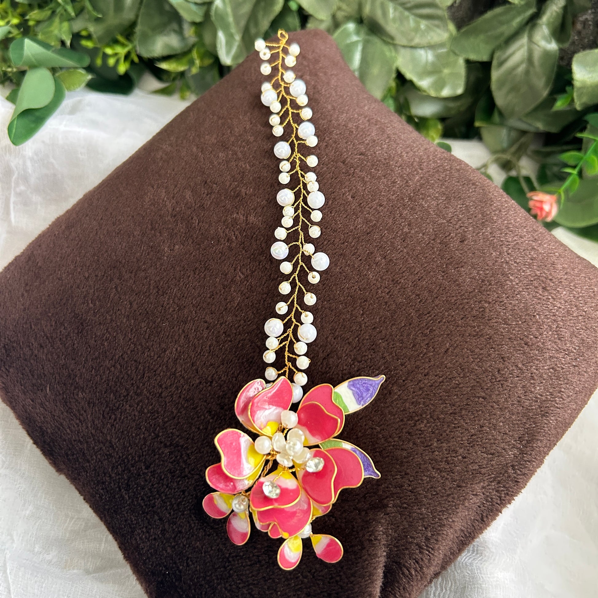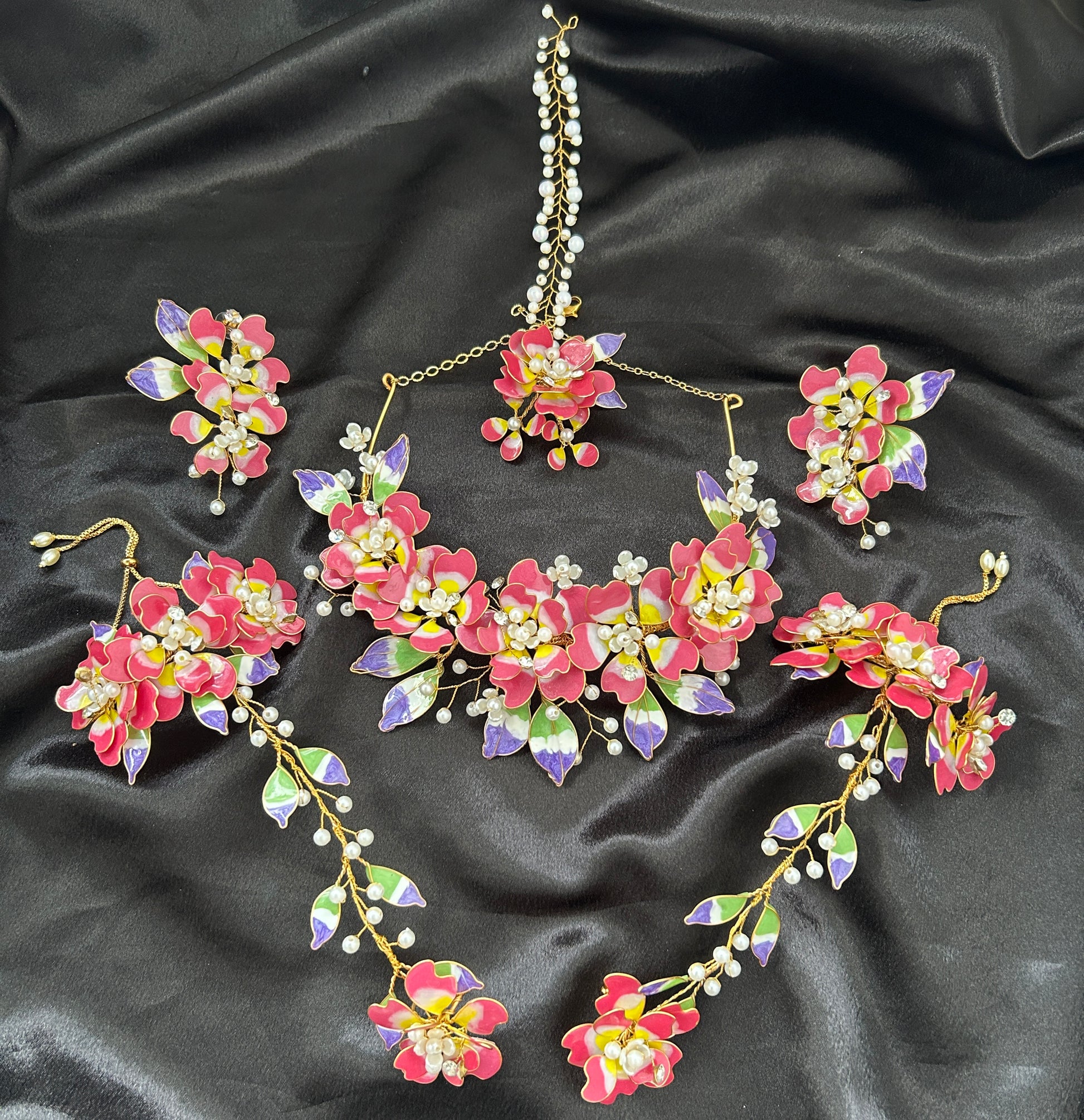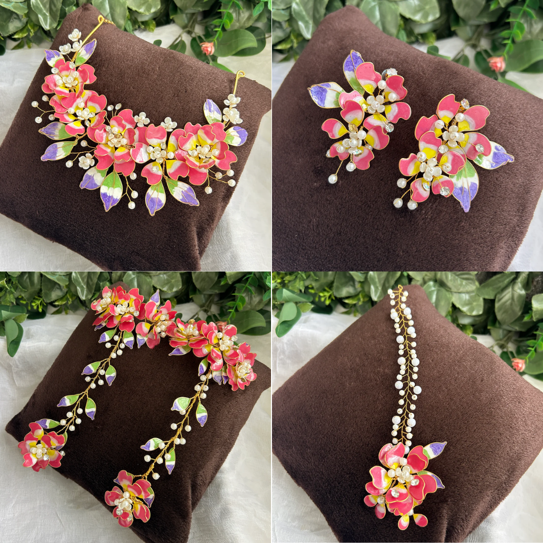 The Emmy Set is soft, graceful, and effortlessly elegant. Designed with delicate floral accents, gentle pearl details, and warm golden tones, the necklace, earrings, hand harness, and maang tikka come together in refined harmony. Perfect for intimate weddings, festive rituals, or serene celebrations—Emmy is timeless beauty with a subtle, radiant charm. ✨