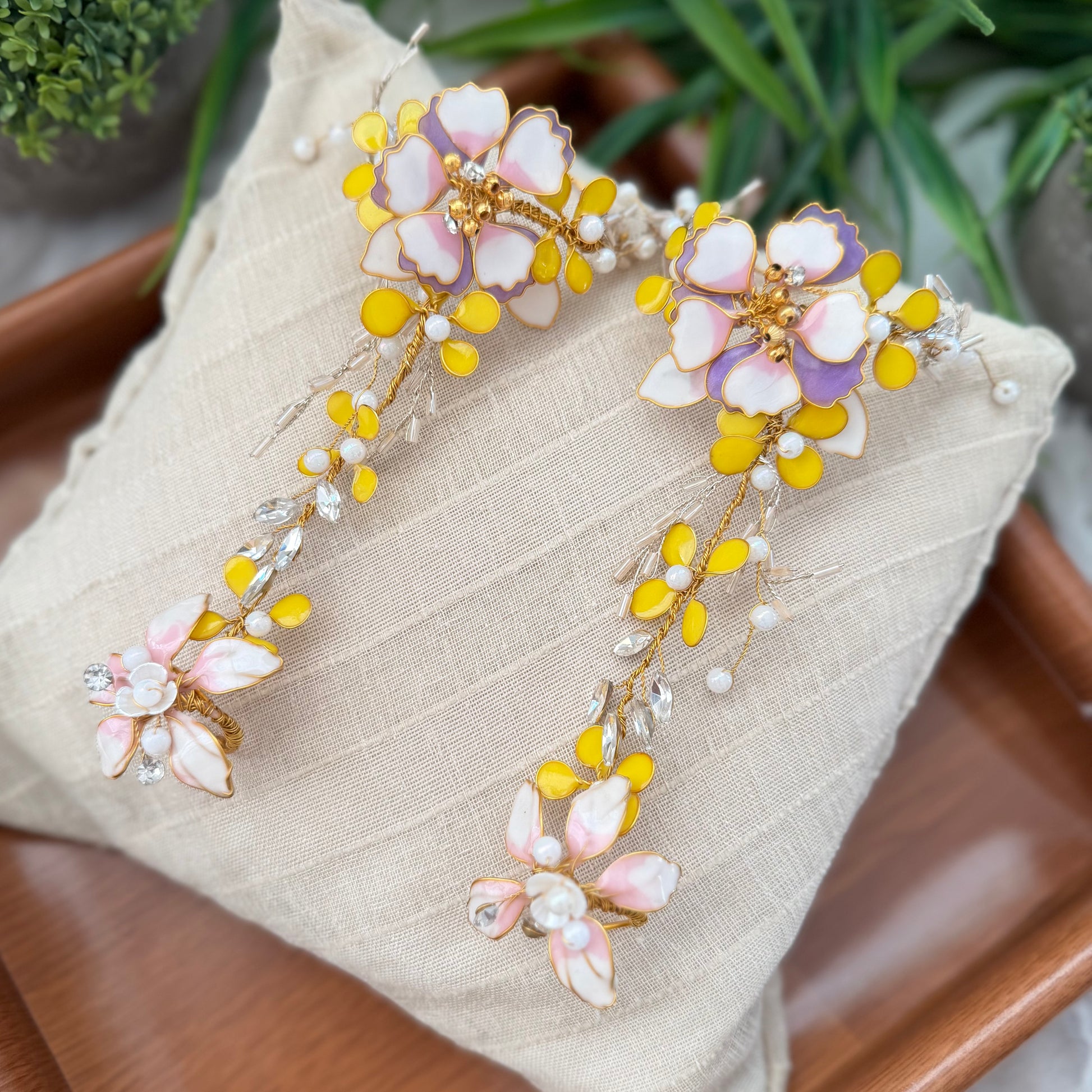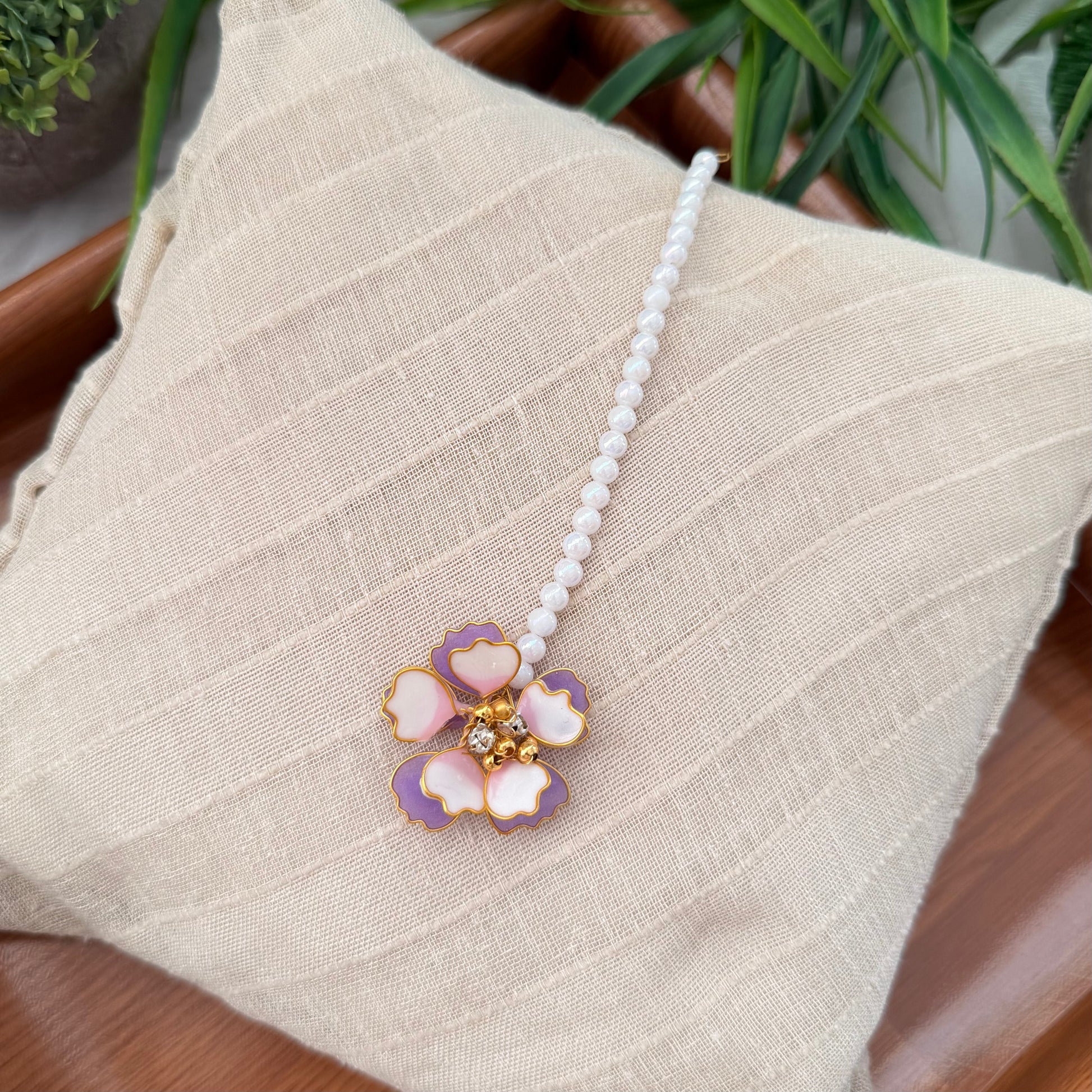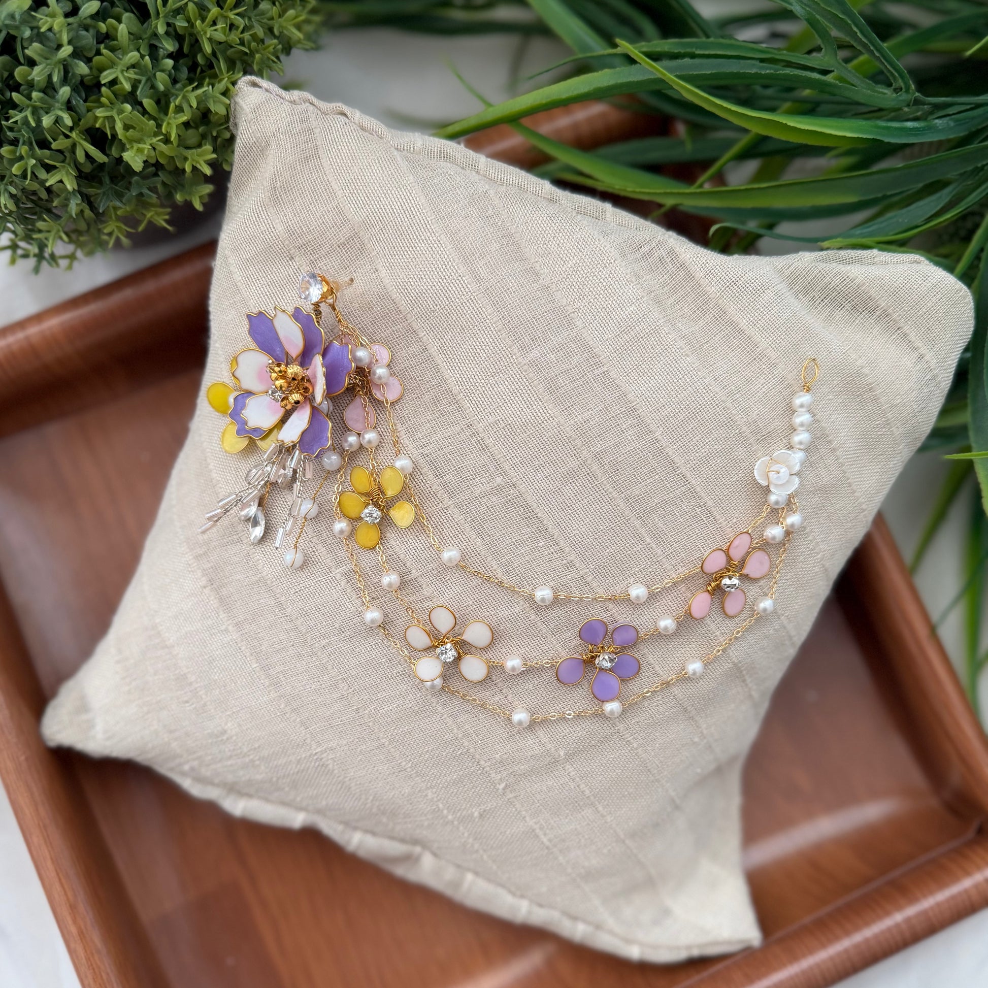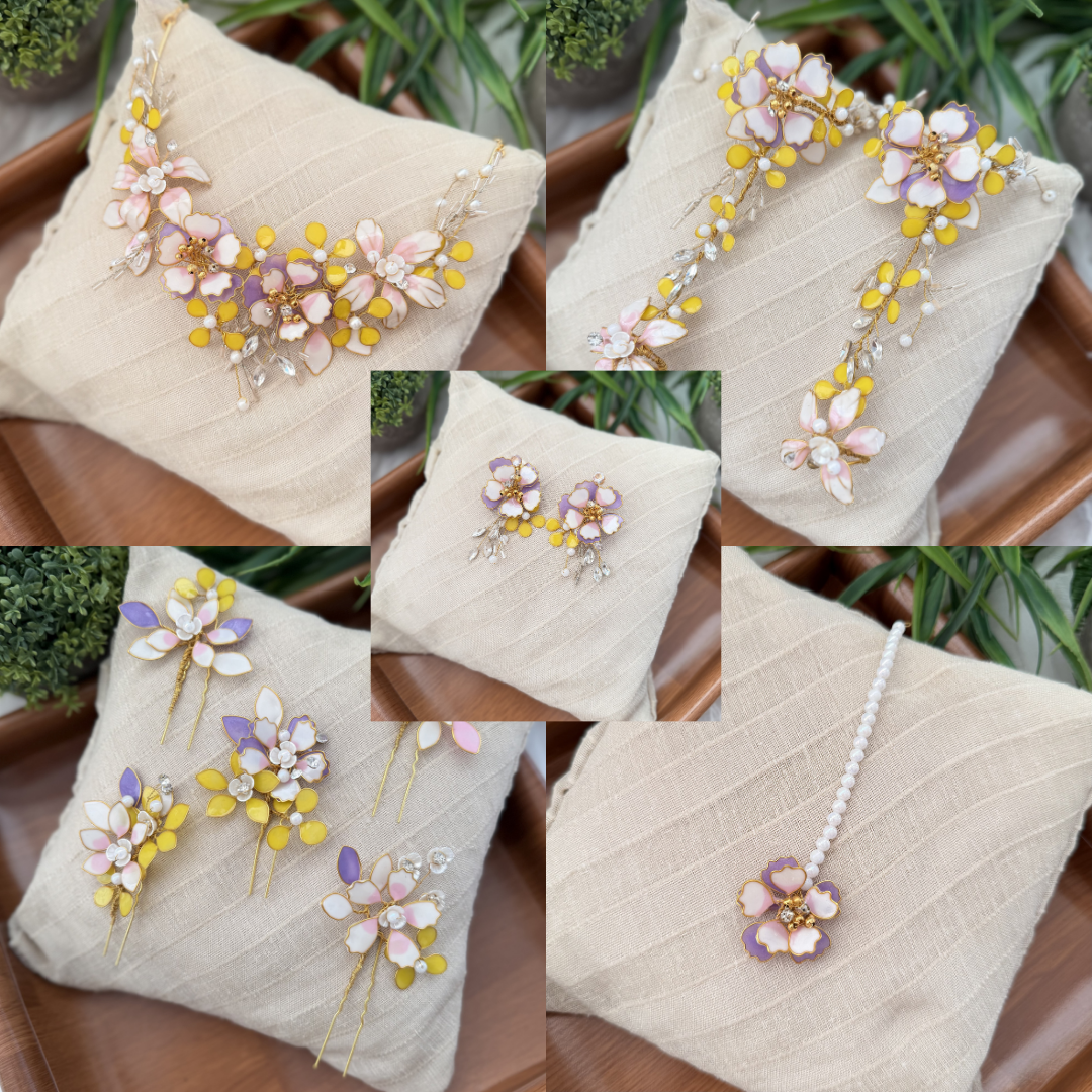 The Gracie Set is soft elegance with a touch of whimsy. Designed with delicate florals, sparkling accents, and golden warmth, the necklace, earrings, hand harness, hair broaches and maang tikka come together in perfect harmony.
