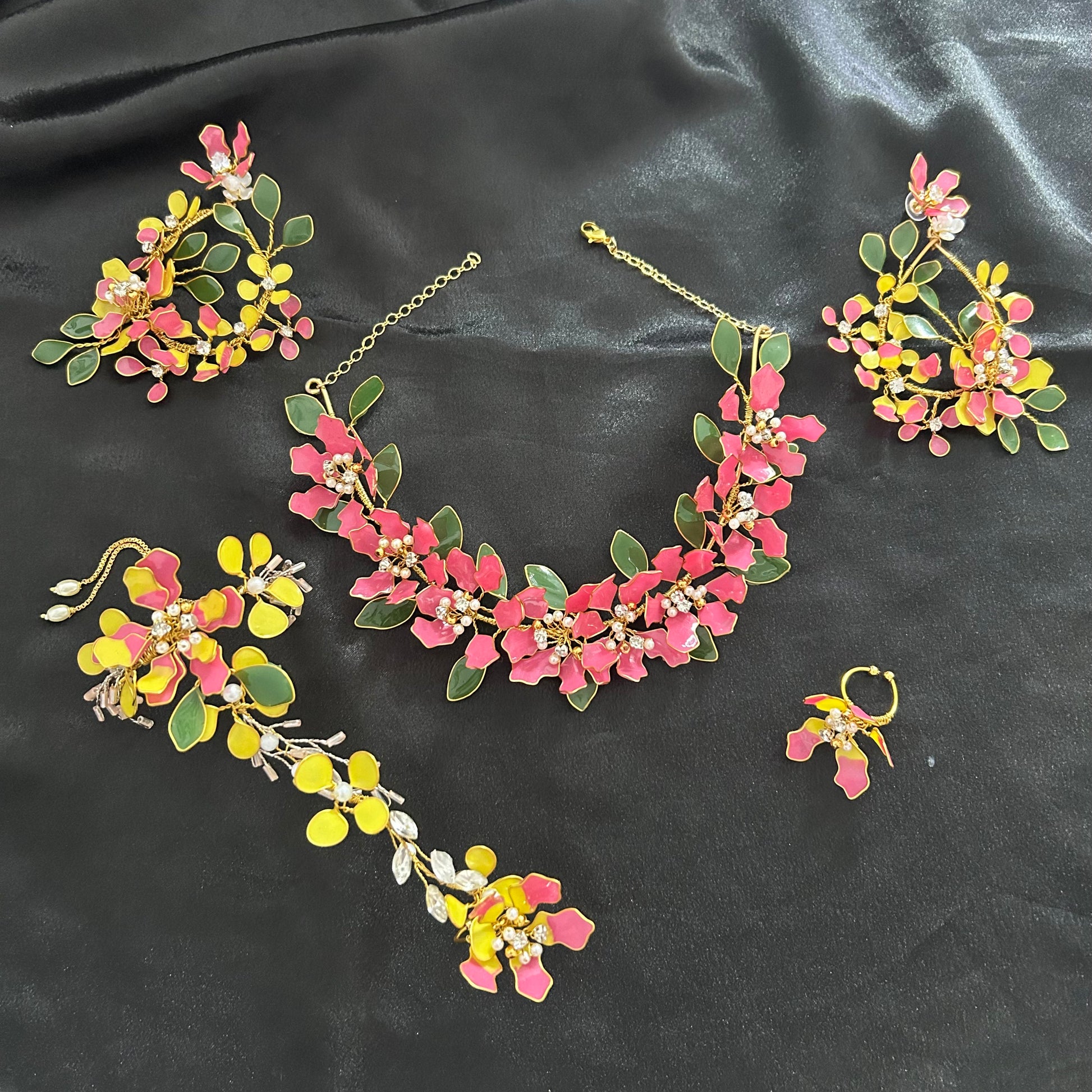 The Kaliyah Set is bold yet graceful, blending elegance with quiet strength. Designed with refined floral detailing, soft pearl accents, and warm golden tones, the necklace, earrings, hand harness, and maang tikka come together in striking harmony. Perfect for weddings, festive celebrations, or statement moments—Kaliyah is timeless beauty with a confident, radiant soul. ✨