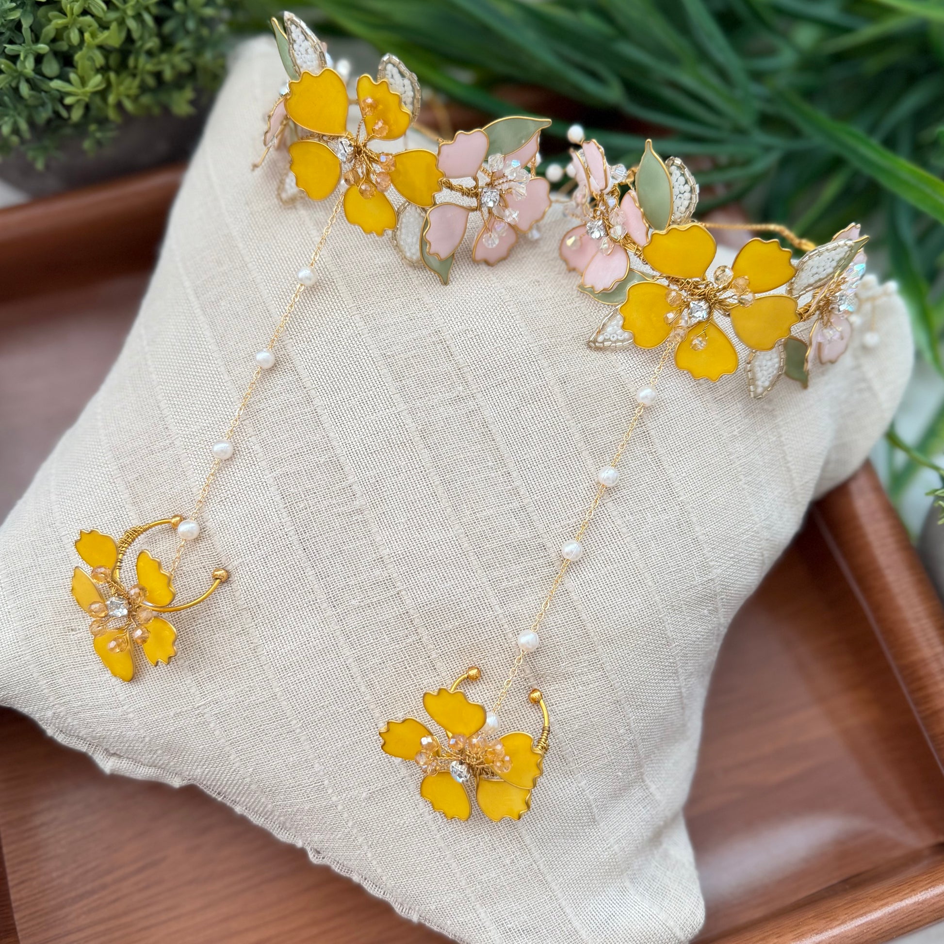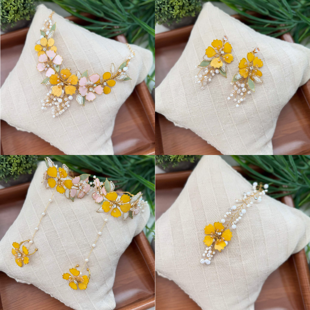 The Lucy Set is delicate, joyful, and full of quiet charm. Featuring dainty crystal accents, soft gold touches, and a light, airy design, the necklace, earrings, hand harness, and maang tikka come together with effortless ease. Ideal for bridesmaids, festive gatherings, or everyday elegance—Lucy is a celebration of simplicity, beautifully styled.