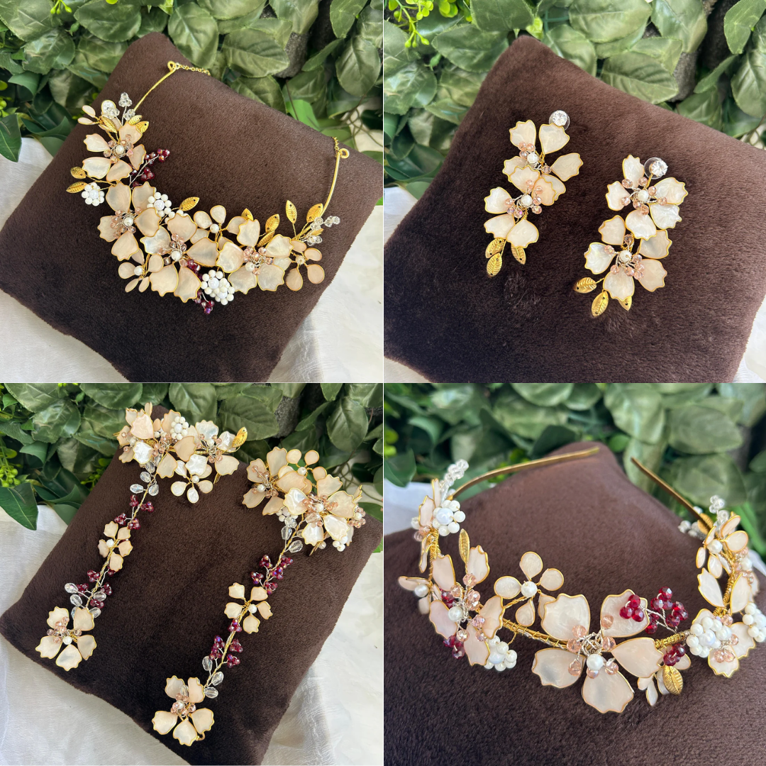 The Selah Set is a melody of grace and beauty. With delicate floral motifs, sparkling accents, and soft golden touches, the necklace, earrings, hand harness, and maang tikka create a harmonious design that feels effortlessly elegant.