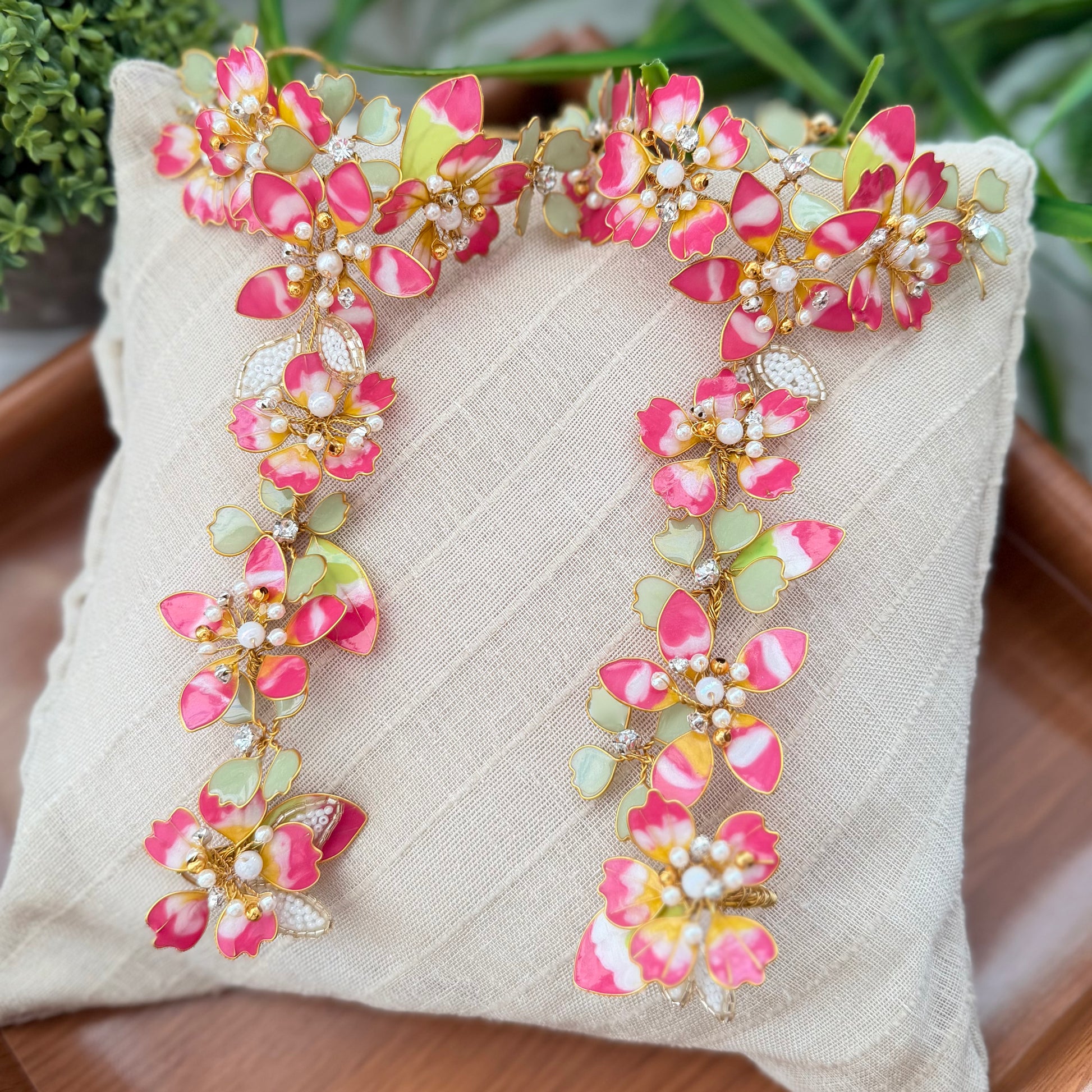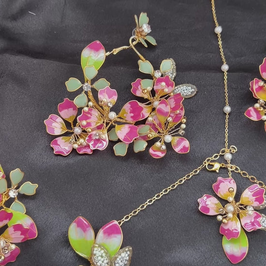 The Selena Set embodies modern elegance with a touch of tradition. Featuring intricate floral craftsmanship, sparkling stones, and radiant golden details, the necklace, earrings, hand harness, Tiara and maang tikka come together in a design that shines with sophistication.