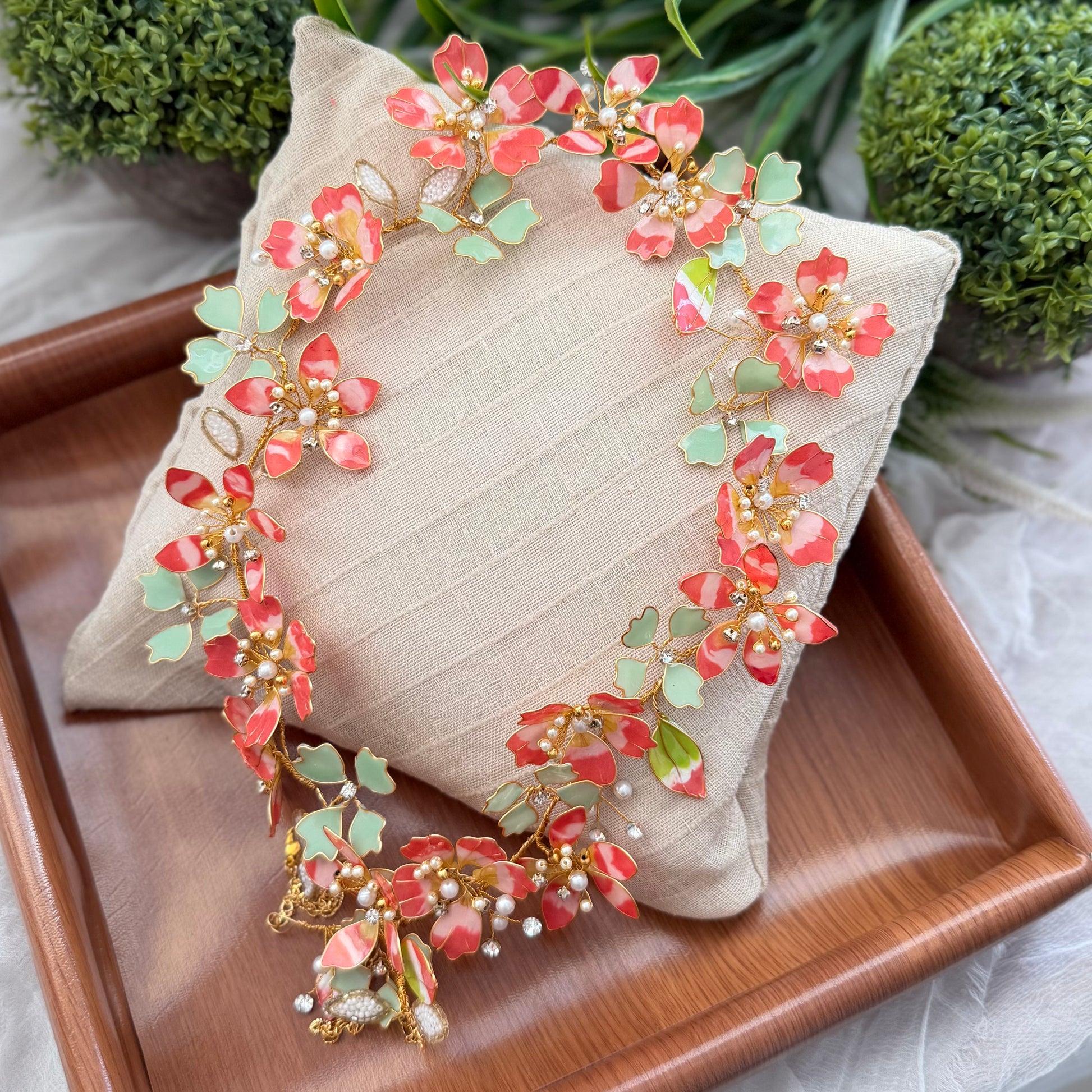 - Net Quantity: 1 Necklace + 1 pair of Earrings + 2 Hand-harness + Tiara + Maangtikka